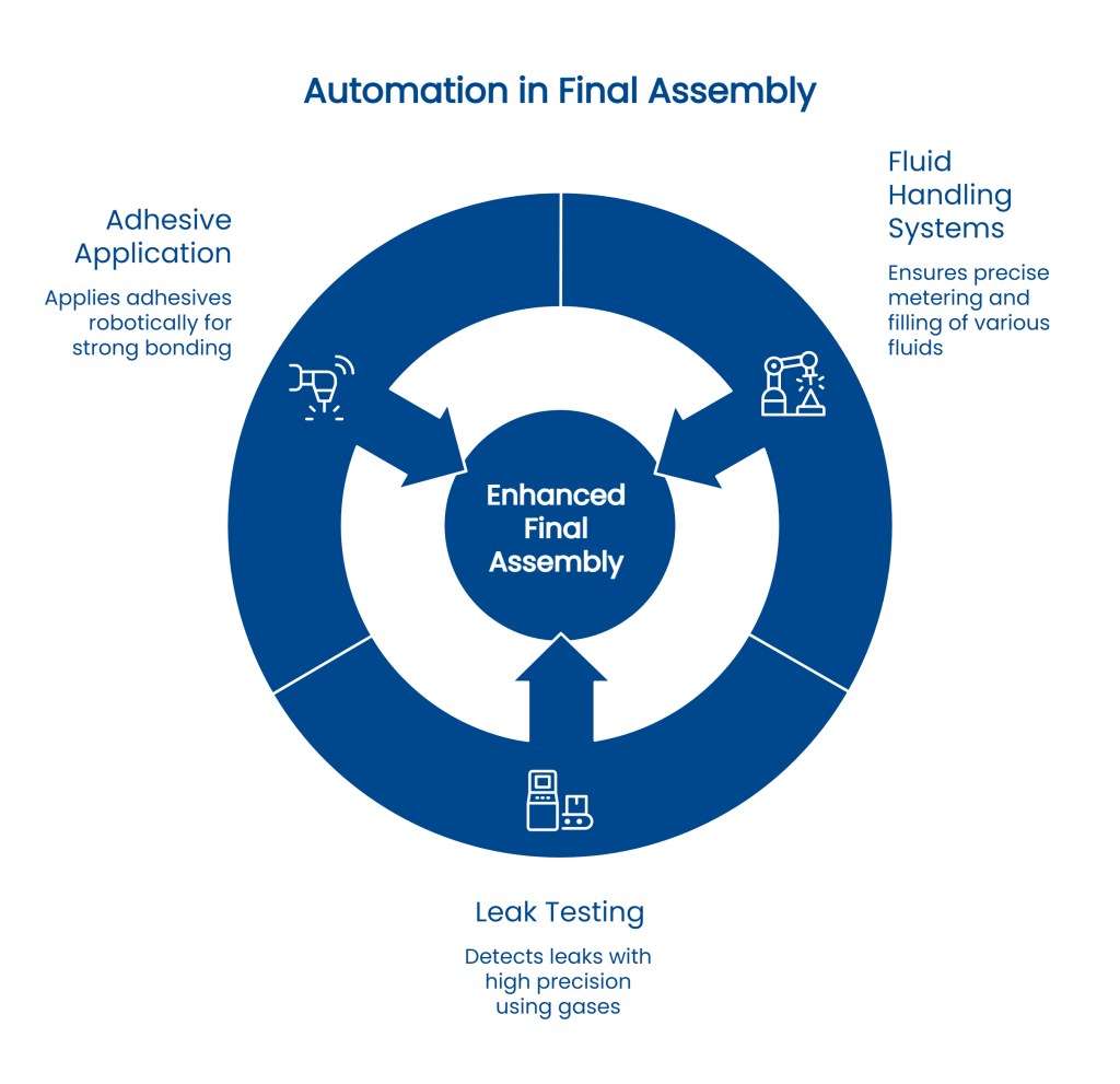 It is the last process in the manufacturing process, where subassemblies and components are joined together to form a complete product. This phase also calls for high levels of material and process control considerations such as fluid filling and adhesion. Manual handling can result in errors, inefficiencies, and extended production times. Automation addresses these issues by performing high-precision, repetitive tasks with minimal human intervention, enhancing speed, quality, and consistency.